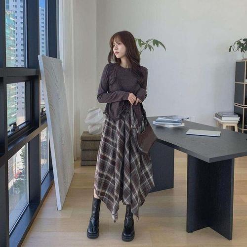 여성 치마 A라인 플레어 언밸런스 스커트 가을 체크 MF3