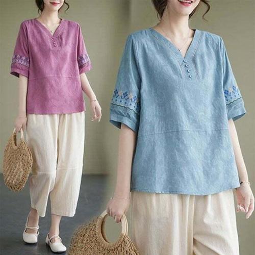 [셀럽하우스]은창)에스닉 TURN1610 소매 자수 헨리넥 티셔츠 블라우스 여름