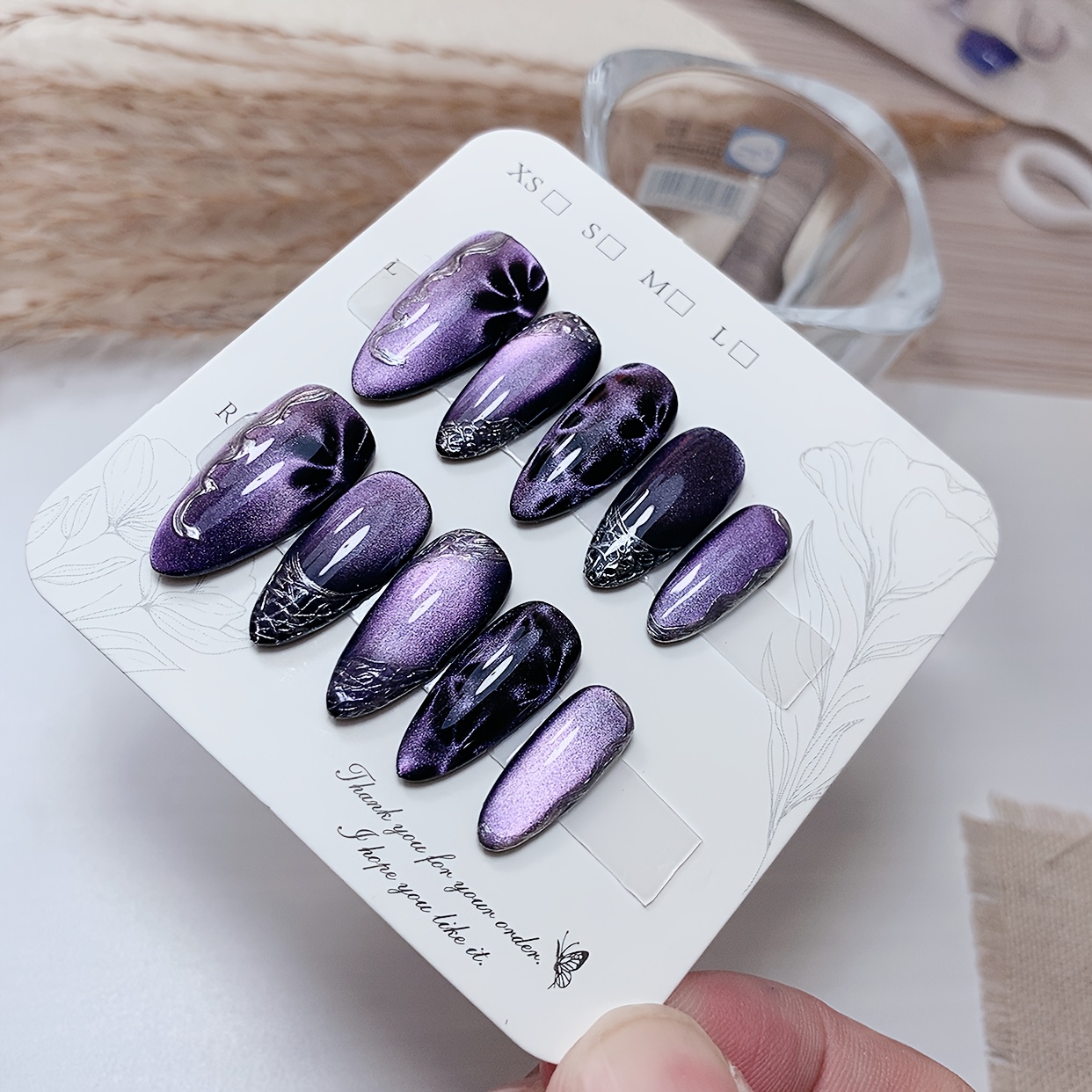 TEMU 1세트 수제 분리형 고양이눈구슬 & 대리석 이펙트 네일스티커 - 보라색 아몬드쉐입, 광택감 있는 마블링 팝아트 디자인, Women용 4가지 사이즈, 우아한 데일리&특별한 날을 위한 네일아트 (접착제 불필요), 홈매니큐어, 고품질 프레션, 뷰티에 민감한