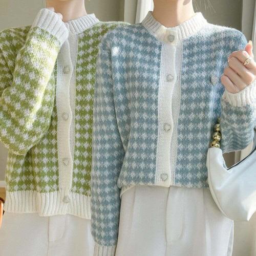[셀럽하우스]여성 XWYE7387 하트 단추 브로치 크롭 체크 라운드넥 가디건