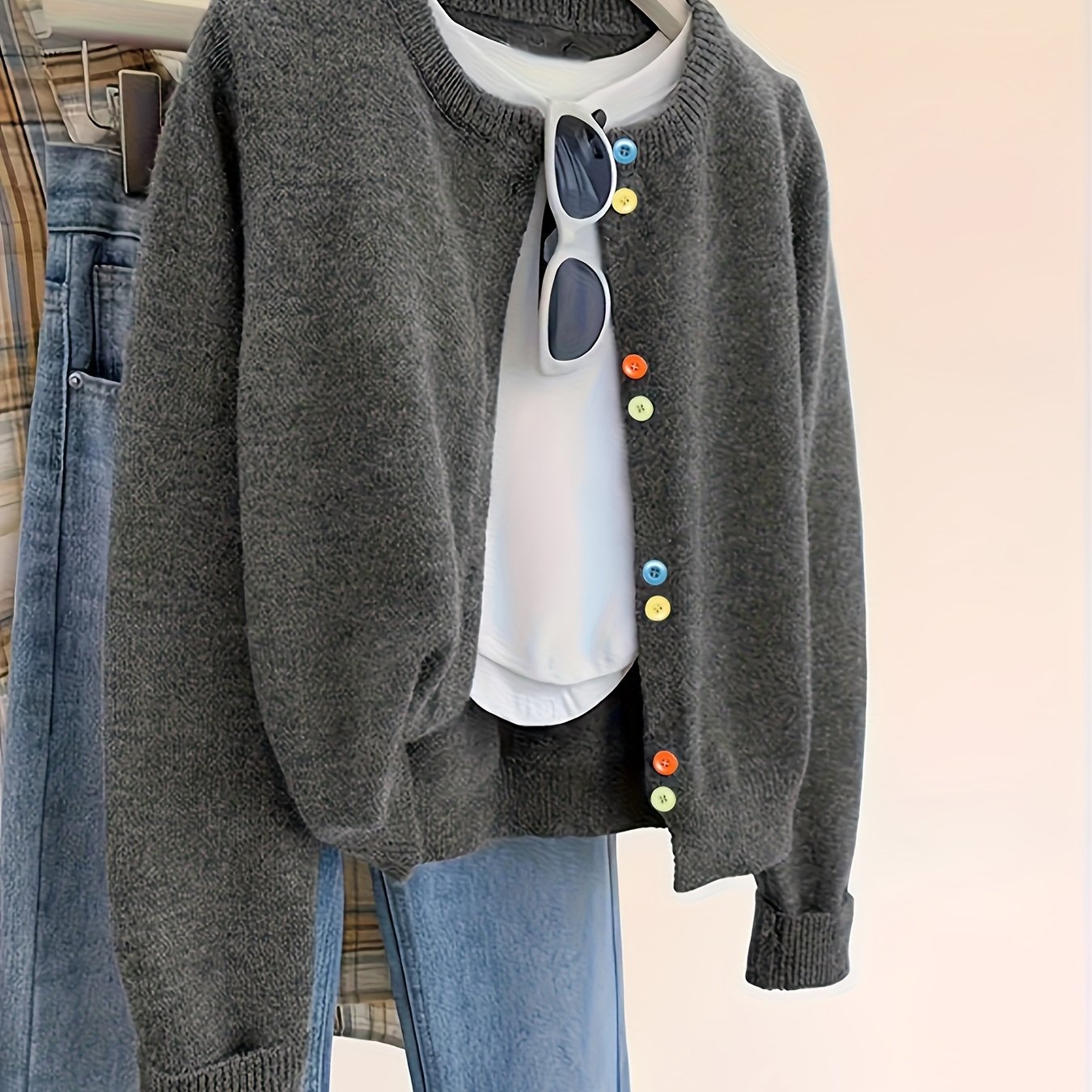 TEMU 플러스 사이즈 - 여성용 레트로 컬러풀 버튼 가디건, 생기 넘치는 단추가 있는 짧은 라운드넥 스웨터, 부드럽고 신축성 좋은 소재, 캐주얼 & 포멀한 아웃핏을 위한 우아한 가을 겨울 레이어링 아이템, 카디건 스웨터, 가을 패션, 클래식 스웨터, 편안한 재질, 스타일리시 탑, 패션 애호가를 위한|가디건|반팔셔츠|반팔니트