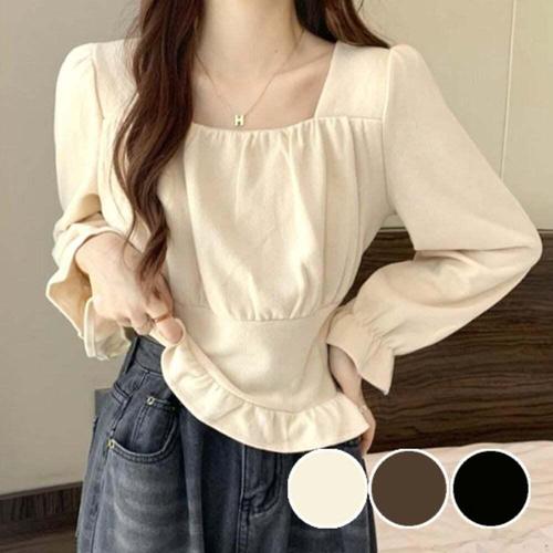 [셀럽하우스]여성 OSHY2332 소매 전면 셔링 포인트 스퀘어넥 긴팔 블라우스