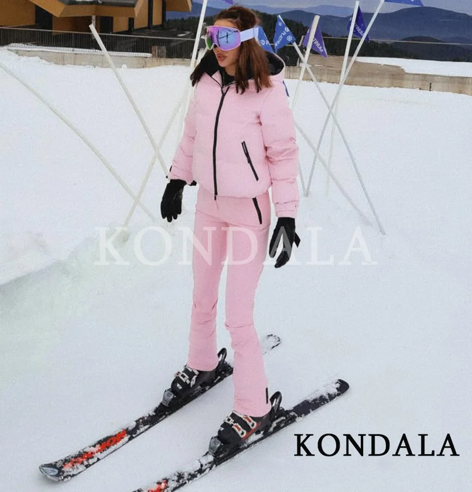 콘달라 여성 트렌디 스키복 후드 패딩 지퍼 스키 재킷, 매칭 스키 팬츠 2025 가을 겨울 패션 우아한 스키 팬츠 세트