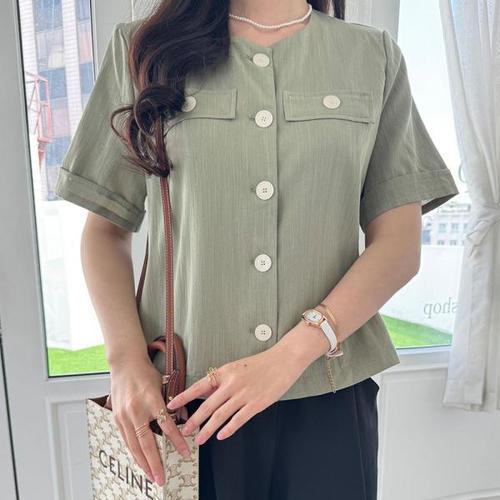 여성 심플 린넨 면혼방 노카라 반팔 자켓