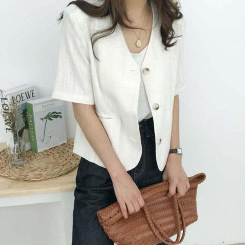 [셀럽하우스]여자 GMDM9068 여성 크롭 노카라 여름 반팔 자켓 린넨 브이넥