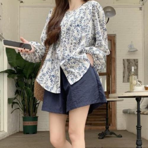 [옷자락]여성 사랑스러운 플라워 패턴 노카라 루즈핏 긴팔 셔츠