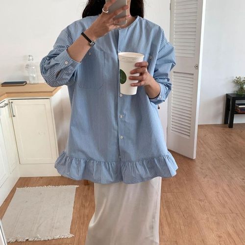 [신상오픈런]여성 프릴 포켓 스트라이프 노카라 박시 셔츠