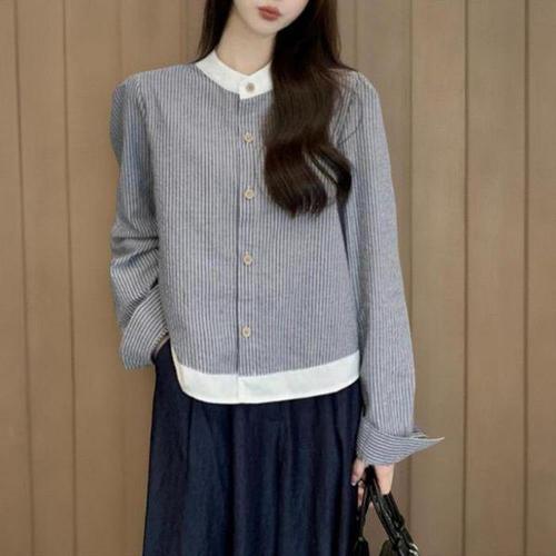 [신상오픈런]여성 클래식 컬러 배색 스트라이프 노카라 긴팔 셔츠