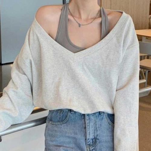 [옷자락] 여성 트렌디 언발란스 오프숄더 브이넥 루즈핏 크롭 맨투맨