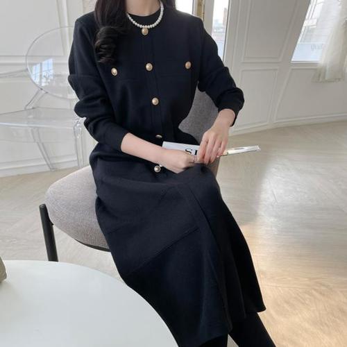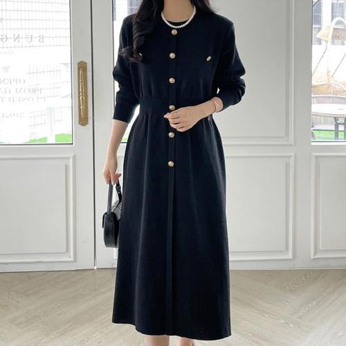 긴팔 단추 행사 골지 가슴 겨울 하객 결혼식 미디 니트 롱원피스 가을 스타일리쉬
