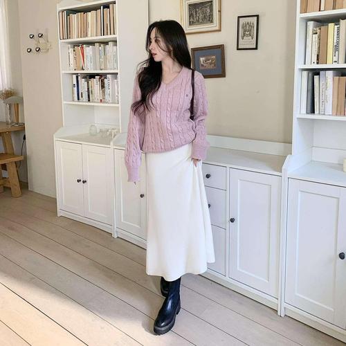 ( )여성 겨울 허리 밴딩 울 니트 부드러운 롱 치마 스커트