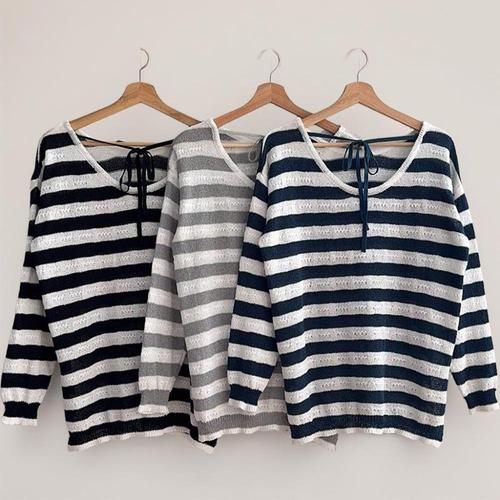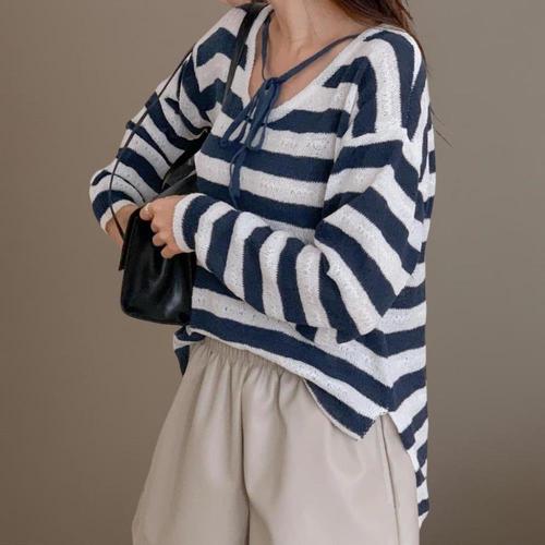|CST96AC|여성 리본 장식 라운드넥 스트라이프 커버업 사이트 슬릿 긴팔 니트