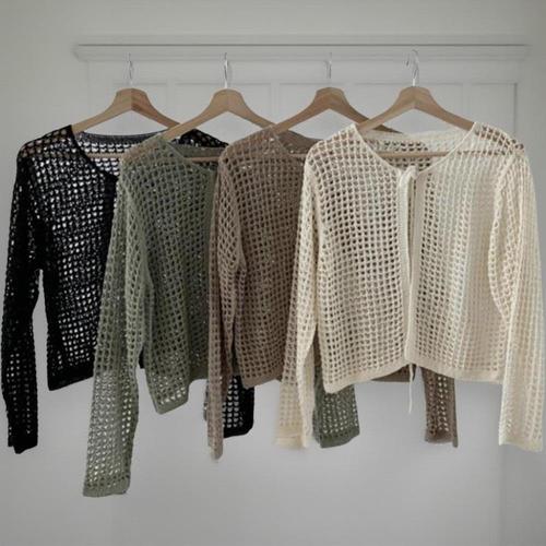 |KMJ65AC|여성 네트 리본 오픈형 긴팔 니트 여름용 커버업 가디건