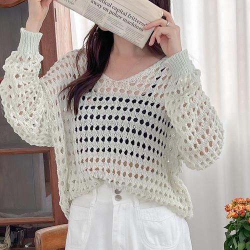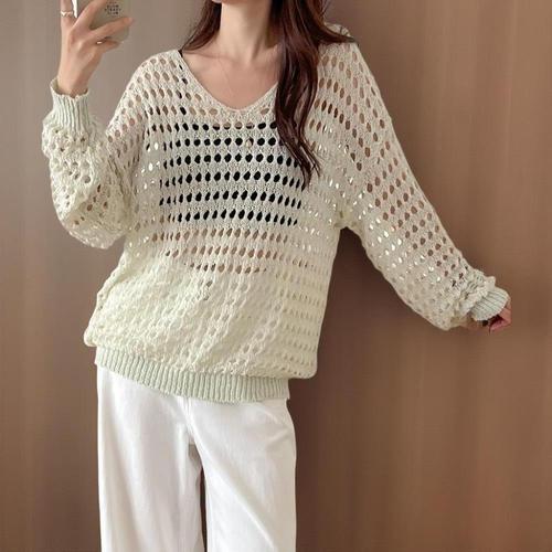 8color 여자 브이넥 여리여리 언발 루즈핏 여름 그물 롱 긴팔 니트 비치웨어