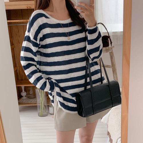 |CST96AC|여성 리본 포인트 라운드넥 스트라이프 커버업 옆트임 긴팔 니트