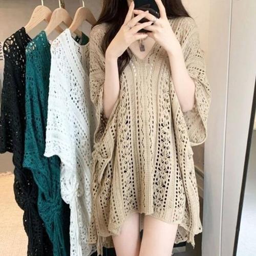 |CST96AB|여성 바캉스 패션 휴양지 펀칭 니트 브이넥 루즈핏 커버업