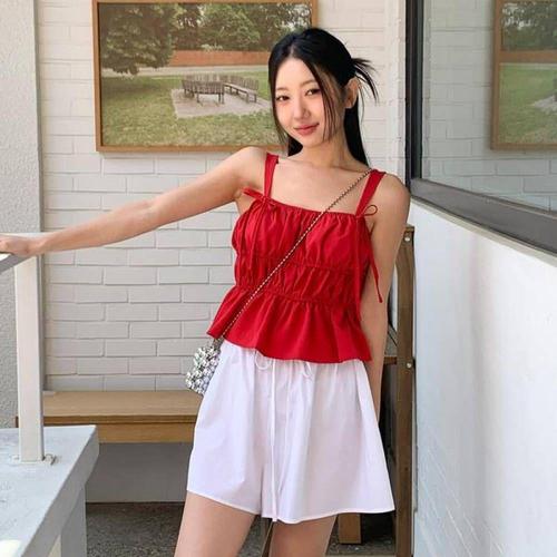 끈나시 쉬폰 여름 휴양지 체크 롱니트 크롭 플 WFKNXMQ