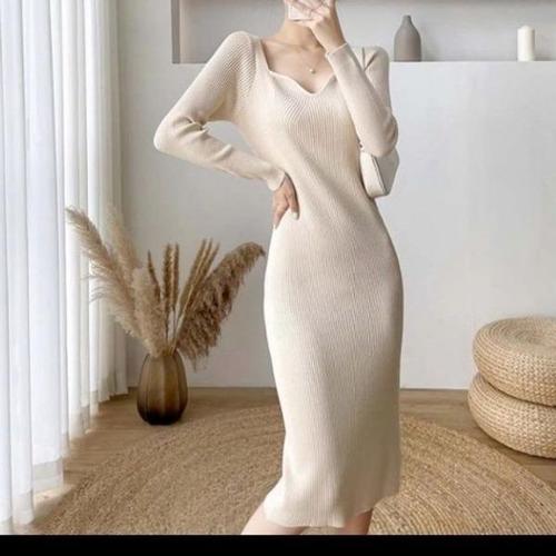 여성용 브이넥 니트 원피스 봄 가을 겨울 긴팔 슬림핏 하객룩 롱원피스