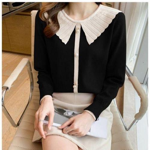 [에이치플러스몰]베이지 진주니트 블랙 와인 물결 카라