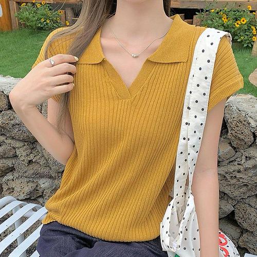 여성 브이넥 골지 카라 니트 반팔티 데일리 티셔츠