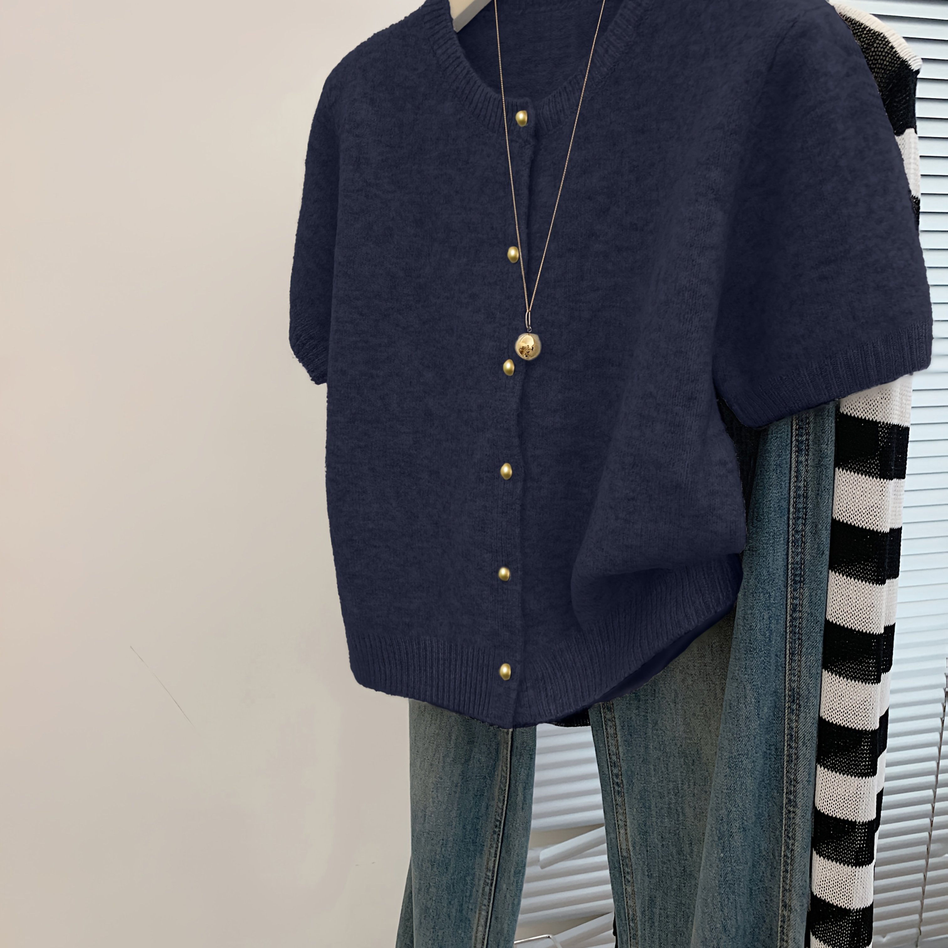 TEMU 새로운 여성용 심플 박시 숏 리브드 탑, 라운드넥 솔리드 컬러 메탈 버튼 여름 가디건