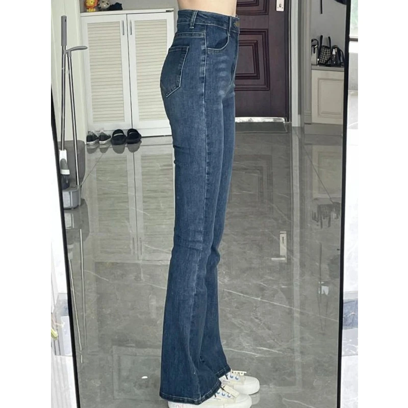 딥 블루 하이웨이스트 여성 데님 진 엘라스틱 플로어-길이 빈티지 스타일 슬림 핏 부츠컷 팬츠 코튼 스트레치 원단