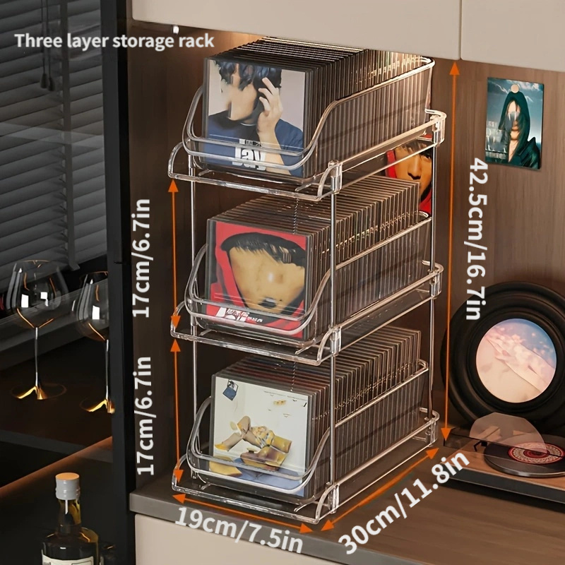 TEMU 당겨서 꺼낼 수 있는 서랍이 있는 3단 투명 플라스틱 CD 및 바이닐 레코드 보관 정리대 - 거실, 사무실용 다목적 미디어 선반, 내구성 있는 공간 절약 디자인, 조립 불필요, 현대적인 외관 | 명확한 가시성