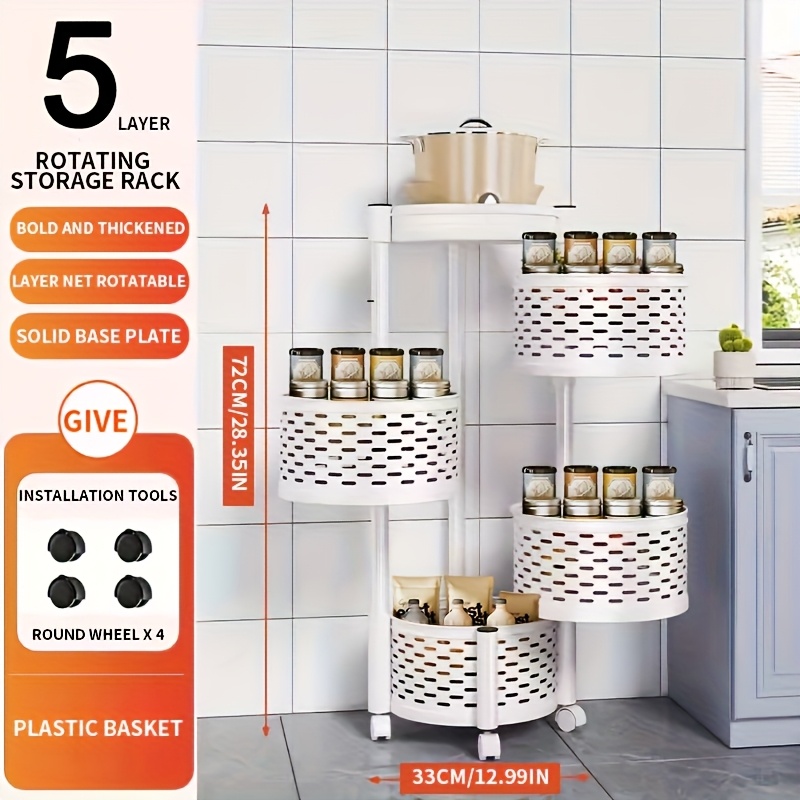 TEMU 회전식 수납 랙 1개, 4개 또는 5개 레이어의 이동식 회전 바구니, 바퀴 달린 이동식 회전 카트, 금속 및 플라스틱 재질의 구조, 원형 주방 수납 카트, 욕실용 바닥 설치형 수납 바구니.