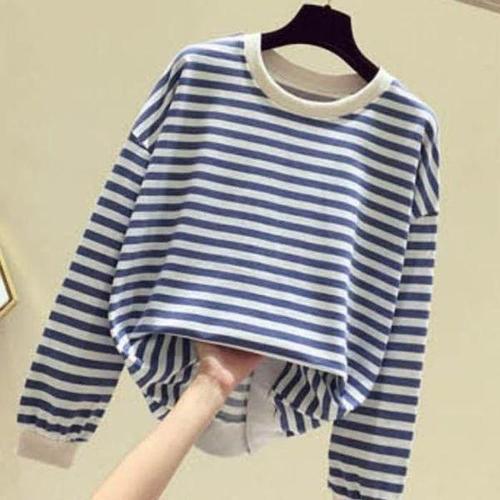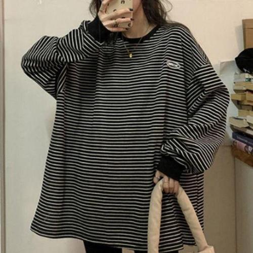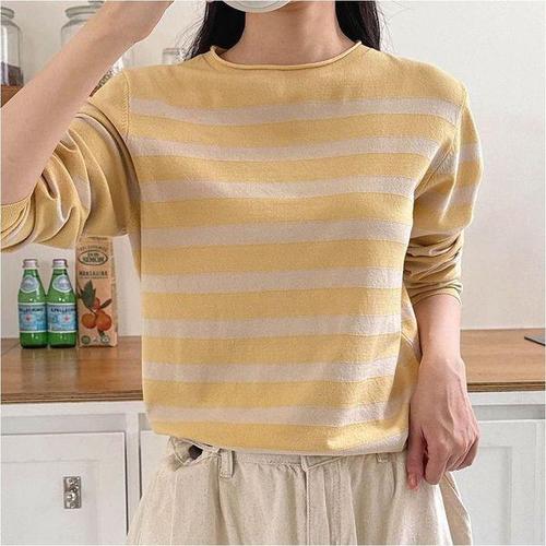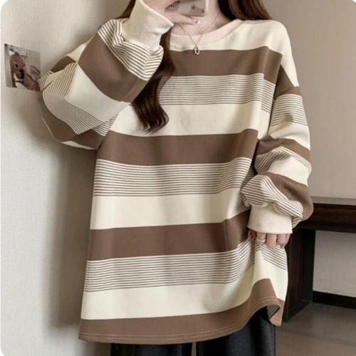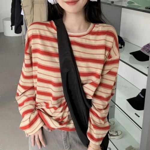 오스틱니 2025 신상 초특가 여성용 봄가을 스트라이프 루즈핏 데일리룩 라운드 긴팔 티셔츠