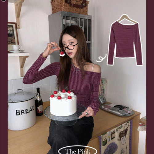 더핑크 / 해번 슬림핏 스트라이프 원숄더 긴팔티