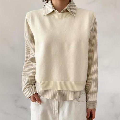 [옷자락]여성 캐주얼 줄무늬 셔츠 루즈핏 크롭 조끼 세트