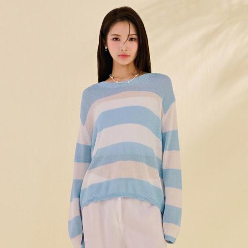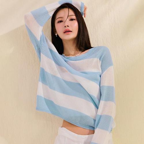 여성 크롭 니트 티셔츠 1P 줄무늬 단가라 드롭숄더