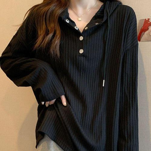 여성 골지 버튼 후드 긴팔 티셔츠 신상 캐주얼룩 WFKMHGG