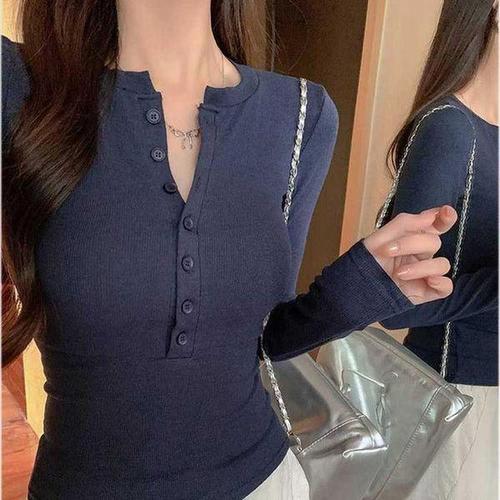 [셀러허브_여성트랜드패션]Rly 단추 버튼 슬릿 긴팔 여성 티셔츠 골지 슬림 핏