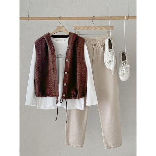 [샵앤]여성 앞단추 밑단조절 레이어드 간절기 후드 니트 조끼 JR-WVS-3745-브라운