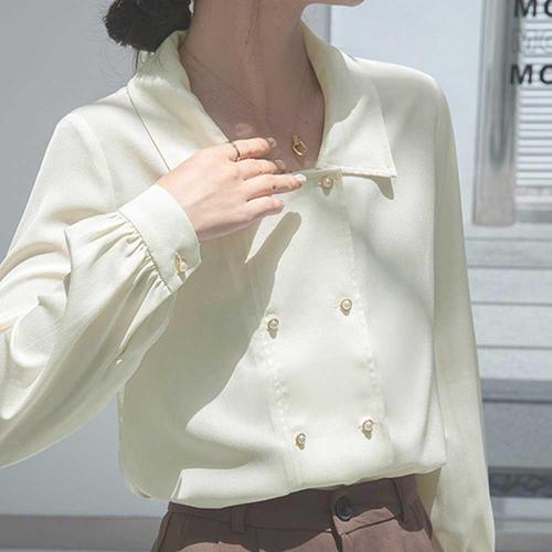 [깨비몰][깨비몰] 여성 봄 가을 더블 진주 단추 새틴 블라우스 (