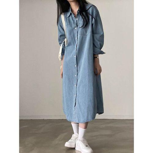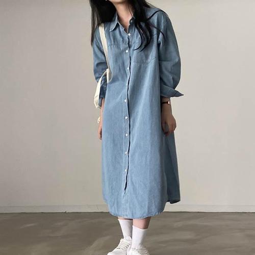 핏몬 여성 포켓 셔츠 데님 롱 원피스 루즈핏 긴팔 청원피스