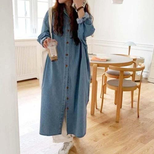 [유야]여성 카라 긴팔 데님 셔츠 롱 원피스 청원피스 -FOP0389- 봄 가을