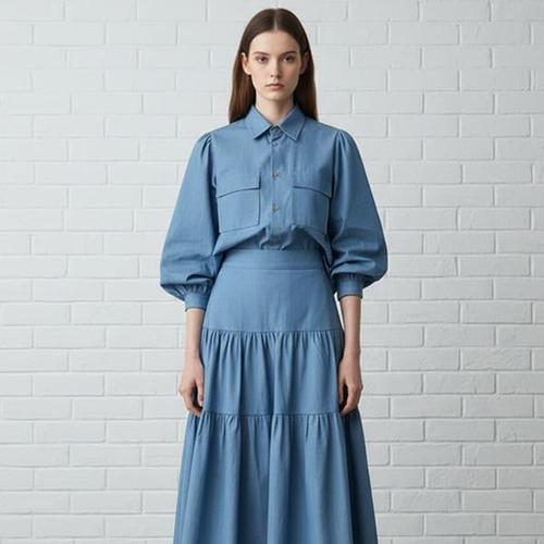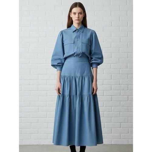 [옷자락]여자 봄맞이 빅사이즈 버튼 카라 캉캉 데님 롱원피스