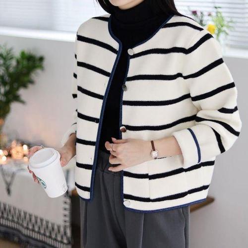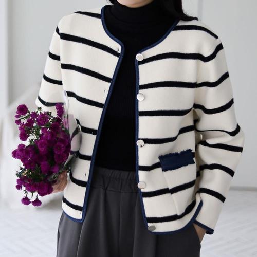 [신상오픈런]여자 스트라이프 데님 투포켓 버튼 라운드니트 가디건