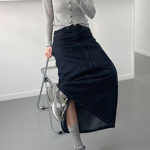 허니제이 / 리모브 데님 절개 플레어 뒷트임 롱 스커트