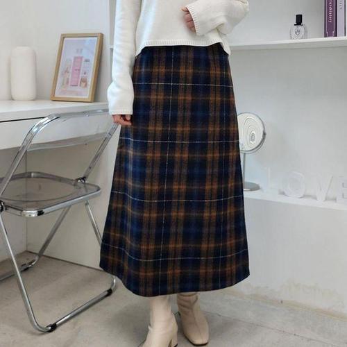 [신상오픈런]여성용 체크 패턴 울 롱스커트 A라인 데이트룩