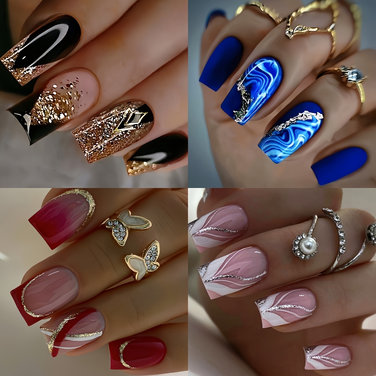 TEMU 96개 아크릴 미디엄 직사각형 혼합 색상 프렌치 프레스온 네일 세트. 글로시 블랙, 블루, 레드, 핑크 색상이 특징이며, 그라데이션 및 패턴이 적용되어 있습니다. 젤리 글루와 네일 파일이 함께 제공되며, 네일 데코레이션에 적합합니다.
