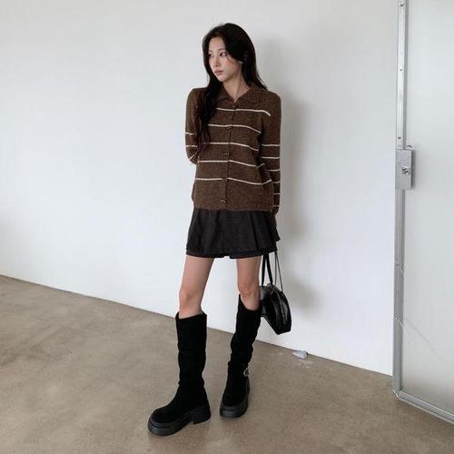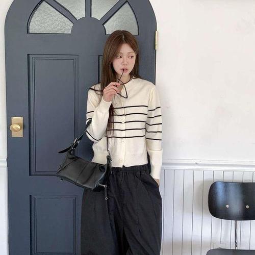[옷자락] 여성 심플 스트라이프 도톰 카라넥 니트 가디건
