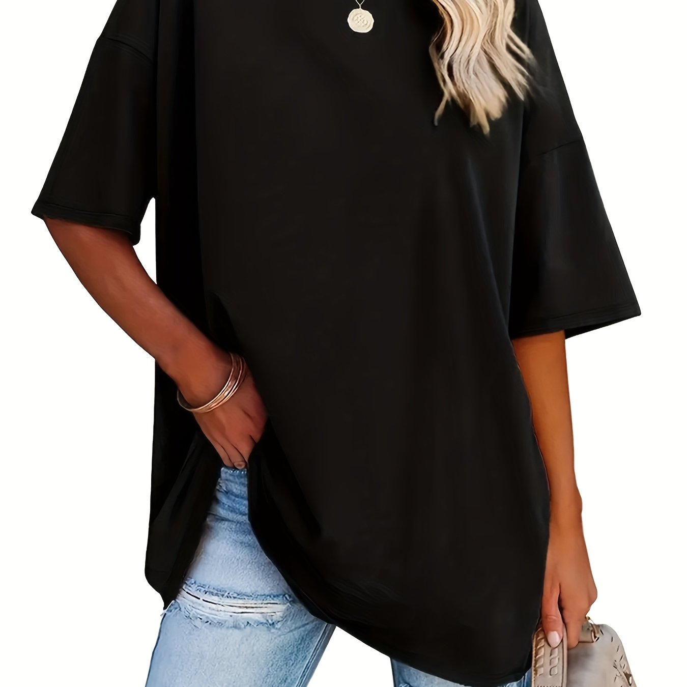 TEMU 여성용 블랙 오프숄더 긴팔 티셔츠 - 캐주얼 루즈핏, 단색, 풀오버 스타일, 가을에 완벽, 다용도 레이어링 피스, 캐주얼 웨어 | 스타일 | 편안한 핏, 여성용 티셔츠/티셔츠, 여성용 상의