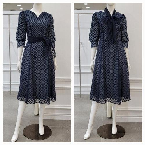 [스타일온미][스타일온미] 엔밀라 도트 스케치 패턴 리본 넥 벨트SET A라인 플레어 원피스