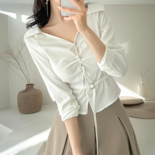 [신상오픈런]여성 클래식 브이넥 긴팔 블라우스 벨트 포함 셔링 디자인