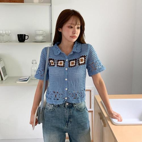 에르디테 / 배색 뜨개 니트 카라 셔츠 반팔 블라우스 가디건 2컬