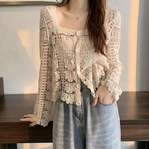 [다잇템_패션]여성 뜨개 키치룩 스웨터 크로셰 V넥 가디건