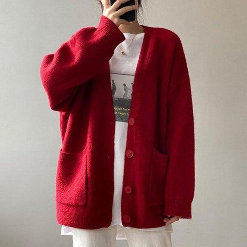 [모노무드]MNO 여성용 V넥 환절기 니트가디건 추절기 두툼한 넉넉핏 브이컷뜨개탑 시그니처 아우터니트